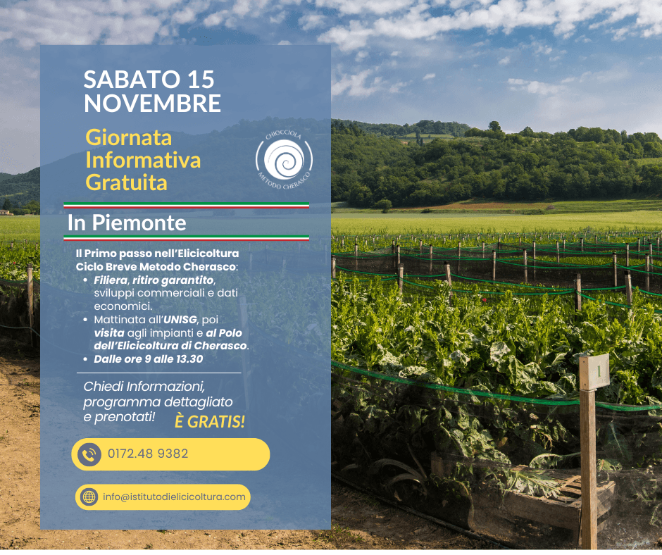 Cherasco (CN) – PiemonteScopri come avviare la tua attività con il Ciclo Breve Metodo Cherasco, il sistema più innovativo e sostenibile per entrare nella filiera dell’Elicicoltura con ritiro garantito del prodotto.